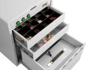 Предназначена для безопасного хранения различных банкнот, монет, пластиковых карт, чеков, ценных бумаг и прочих документов в течение рабочего дня