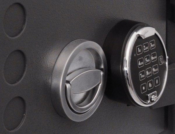 - На дверь установлен американский электронный замок Sargent&Greenleaf, модель Spartan 1006, обладающий сертификатами: VdS Class 2, UL Type 1, CEN B и т.д. Замок защищён от подбора кода и допускает до миллиона кодовых комбинаций.